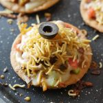 Papri per pizza sauce dal ker pheela lein,cooked chicken,shimla mirch,pyaz,tamatar,cheddar cheese, mozzarella cheese,lal mirch crushed aur dried oregano dal ker dahk dein aur halki ancch per cheese melt hunay tak paka lein (2-3 minutes).