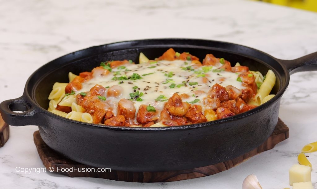 Cast iron pan mein penne pasta,cooked chicken,mozzarella cheese,hara pyaz aur black & white til ker dhak dein aur halki ancch per cheese melt ho janay tak paka lein (4-5 minutes).