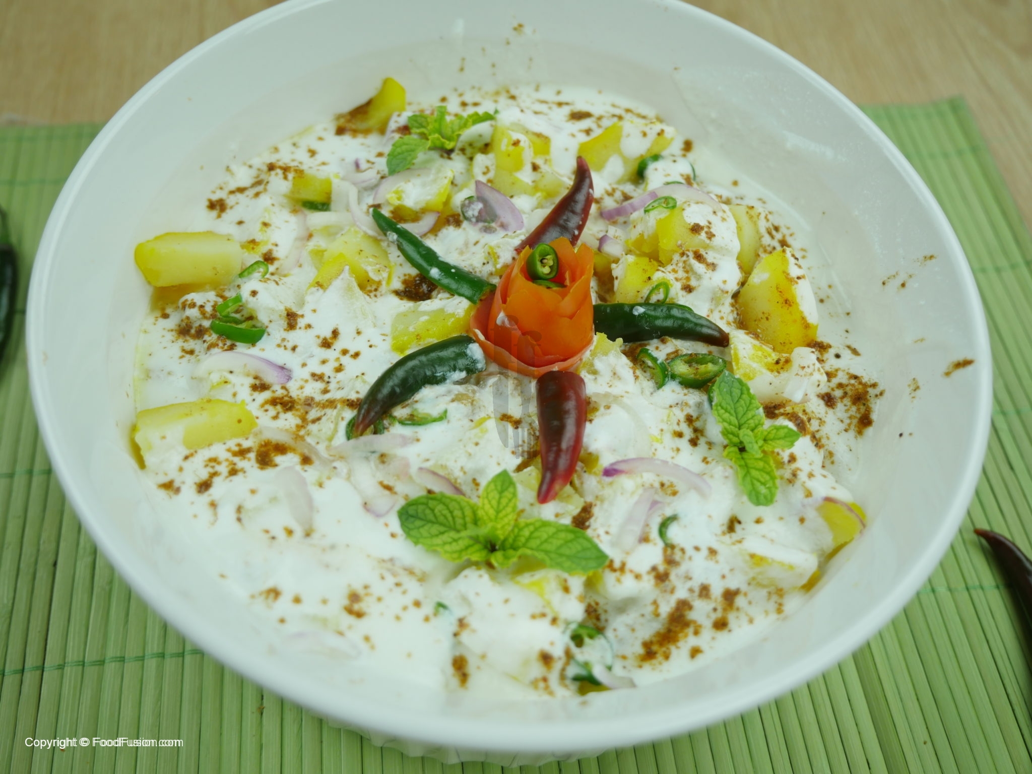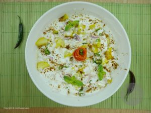 Beat yogurt. Add a layer of potatoes than add yogurt layer on chickpeas. Add green chili. Garnish with chaat masala and serve.