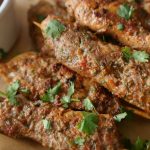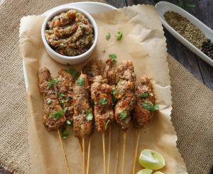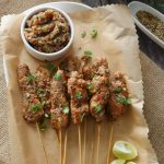 Thread chicken strips into skewers and apply grinded tomato mixture on chicken skewers & reserve half grinded tomato mixture for serving.