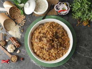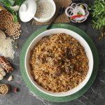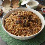 -Now add cooked meat,sprinkle reserved ground spices (1 tsp),cover with kitchen cloth & lid and cook on high flame for 2 minutes to build up steam then steam cook on low flame for 8-10 minutes.