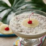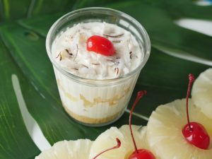 Sprinkle fresh coconut and top with cherry.