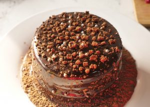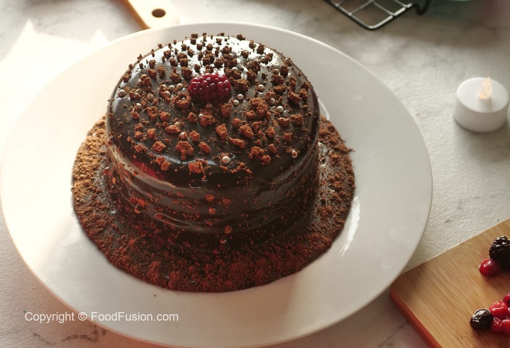 Now pour prepared chocolate glaze on the cake, sprinkle cocoa powder & sprinkles of your choice.