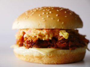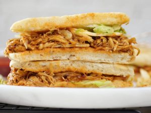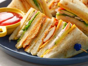 Bread slice mein pulled chicken dal ker pheela lein,kheera slices aur tamatar slices dal dein, another toasted bread slice rakh dein,tomato ketchup,ice berg,tayyar anda aur chedder cheese slice rakh ker upper sa toasted bread slice rakh dein (makes 4-5 sandwiches).