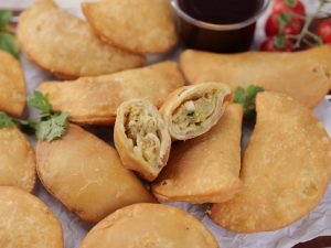 -Pani laga lein aur rolled dough ko filling ka upper dal dein phir round cutter ki madad sa half-moon cut ker lein & edges ko gently press ker ka seal ker lein.