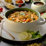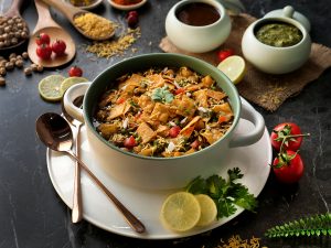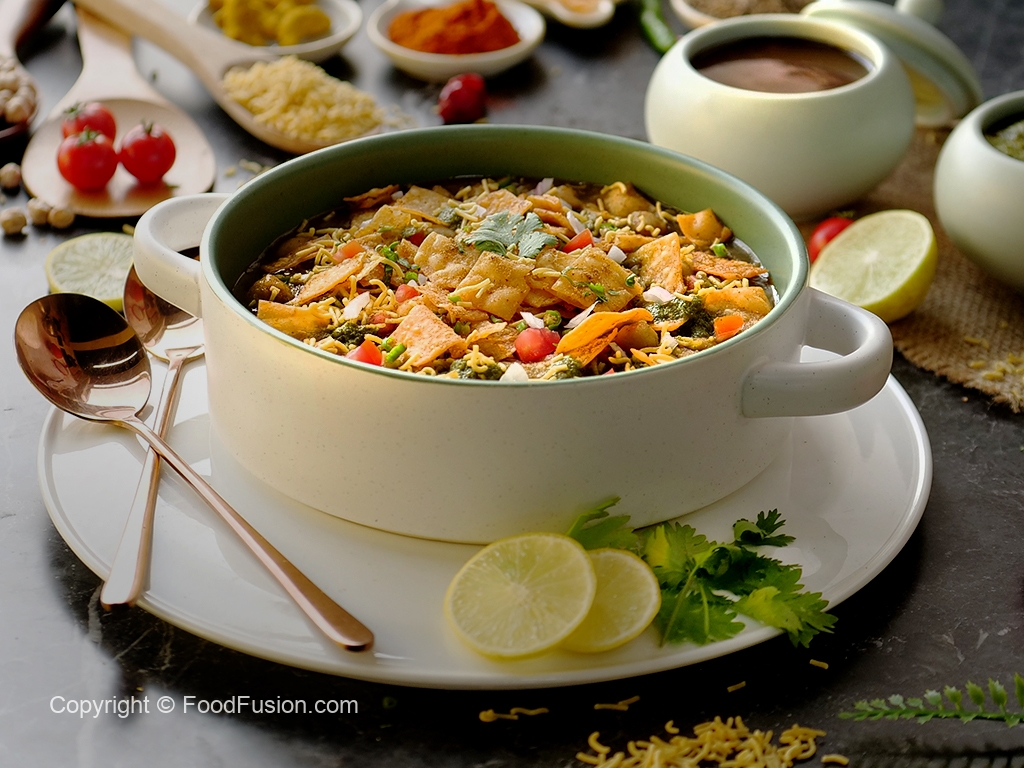 Serving dish mein radga chaat,pyaz,tamatar,hari mirch,spicy green chutney,tamarind sauce,sev nimco,papri,hara dhania aur chaat masala dal ker serve karein!