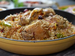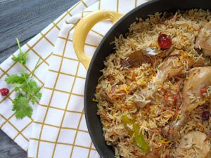 -Green chillies, orange food color, fried onion, lemon slices, fresh coriander, mint leaves dalain, phir kitchen cloth aur lid se cover kar ke dum par 10-12 minutes paka lein.