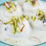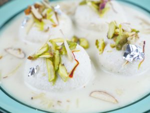 Place cheese balls on serving plate, pour sweet milk (rabri).