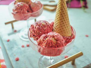 Skewer ki madad sa gently swirls bana lein,ice cream ki surface ko butter paper sa cover ker lein aur dhak ker 8 hours ya overnight kliya freeze ker lein (yields: 2.5 litres).