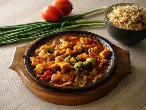 Wok may tel garam kren or pyaz, bhindi, hari mirch daal kar 6 se 6 minute tak high flame par fry karen k golden brown hojaye or nikal len.