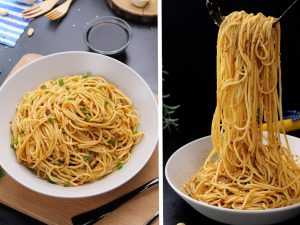 In a serving dish, add boiled rice & drizzle prepared sauce over it. Add prepared chicken with vegetables, boiled spaghettis, fried garlic & green chillies, prepared sauce, garnish with spring onion green & serve!