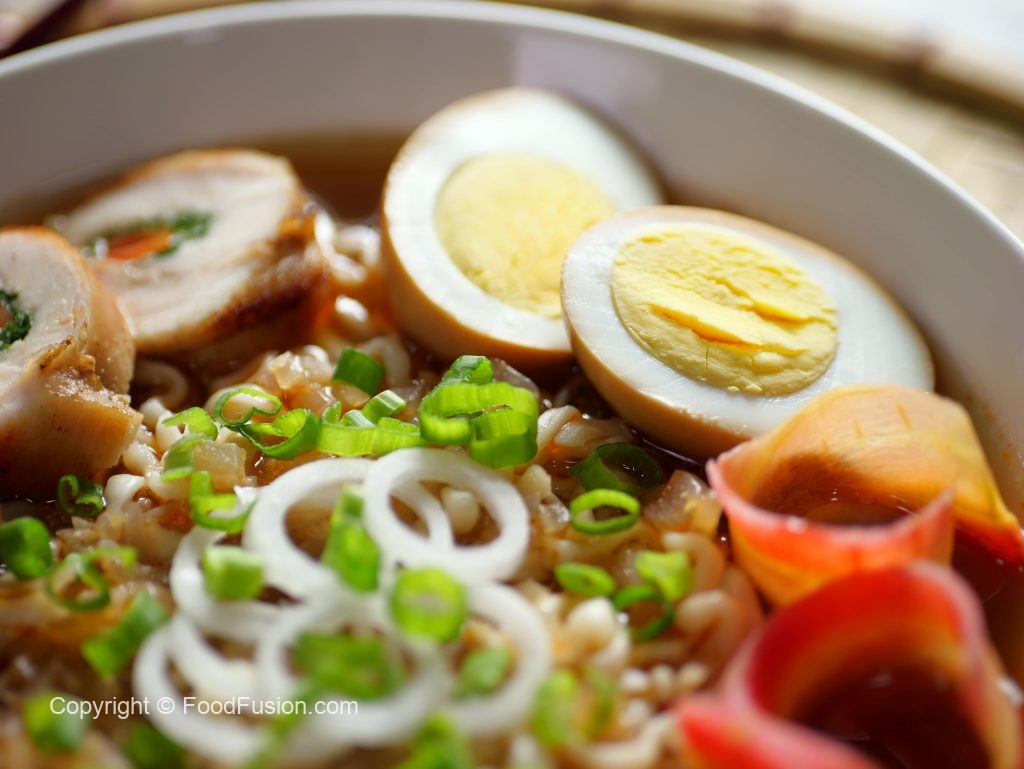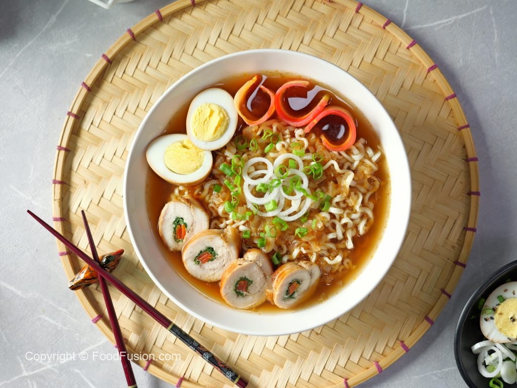 -Serving bowl mein ramen noodles, carrot, chicken slices, soy sauce eggs, reserved chicken broth, spring onion aur spring onion leaves dal kar serve karein!