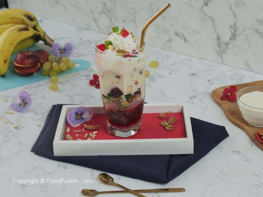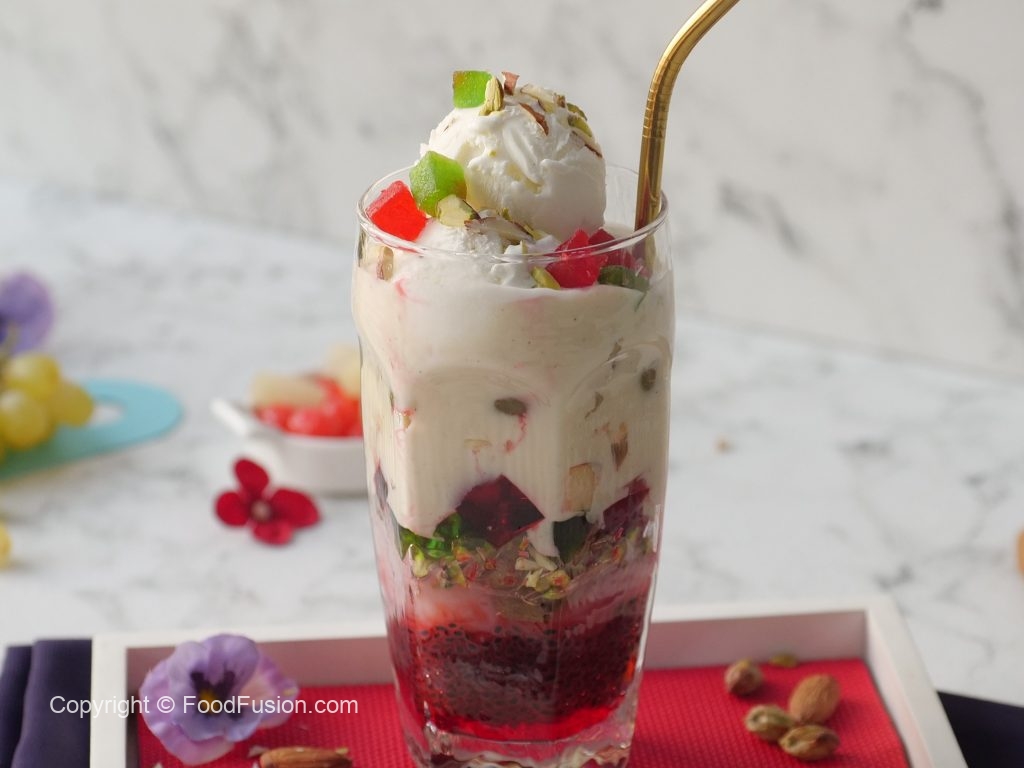 -Serving glass mein soaked tukhme Balanga,lal sharbat,tayyar falooda sawaiyan,mixed nuts,green jelly,red jelly,saib,banana,garpes,pineapple,tayyar rabri, aur vanilla ice-cream dal dein,mixed nuts aur tutti frutti sa garnish ker ka serve karein!