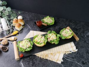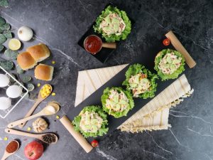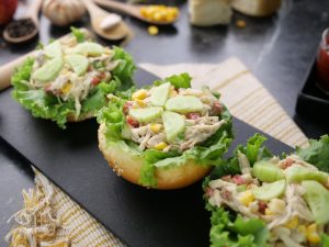 -On each air fried/toasted burger bun,place lettuce leaf,prepared chicken salad & garnish with cucumber & serve! (Serves 6-8)