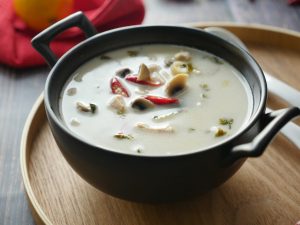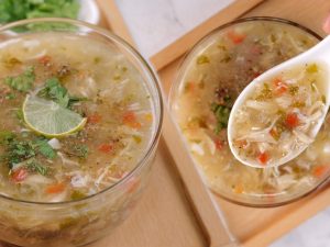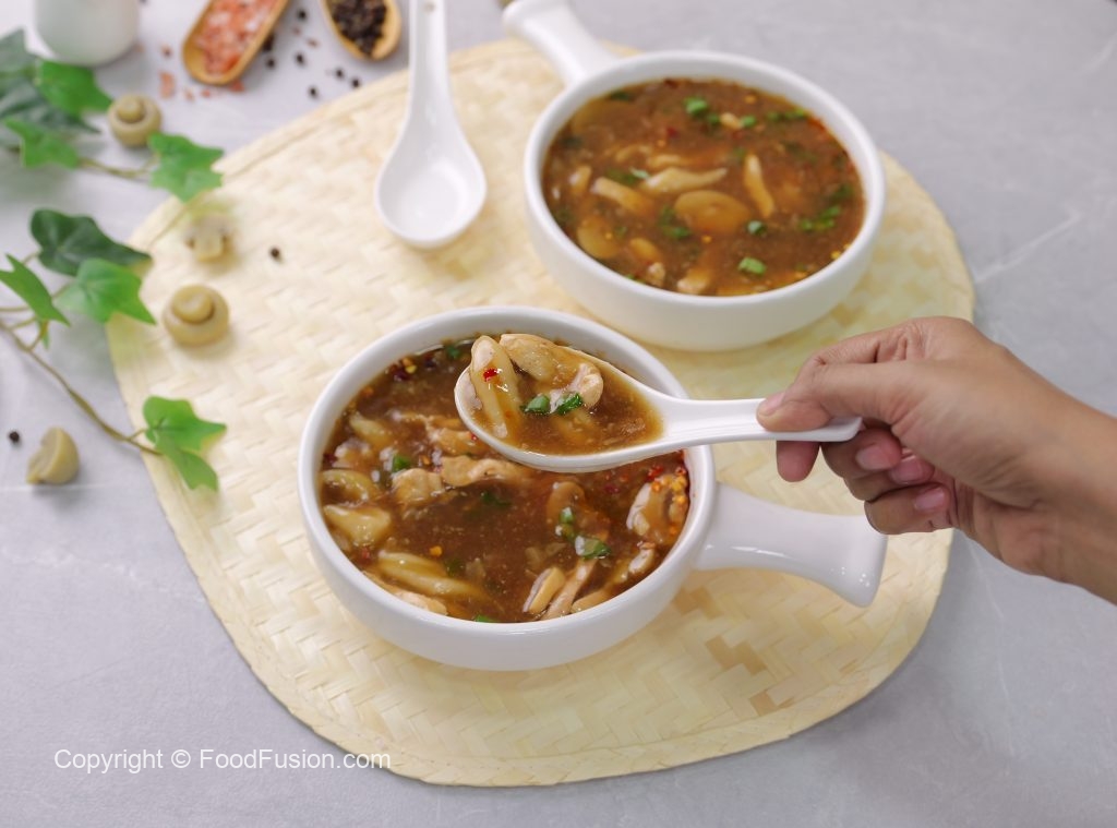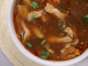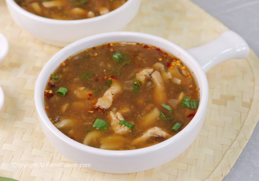 -Serving bowl mein lal mirch crushed,soy sauce,til ka tel,soup aur hara pyaz leaves dal ker serve karein!