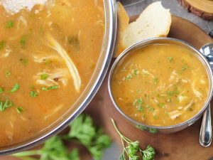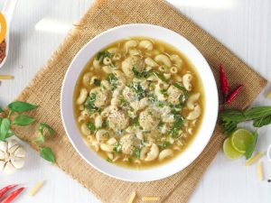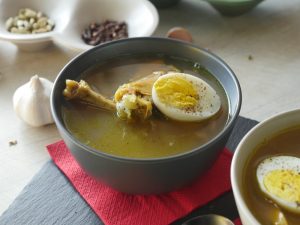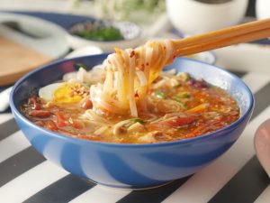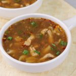 -In serving bowl,add red chilli crushed,soy sauce,sesame oil,soup,green onion leaves & serve!