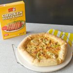 Add mozzarella cheese,cooked chicken,mushrooms,onion,red chili crushed,cheddar cheese,capsicum, mozzarella cheese and sprinkle red chili crushed (makes 2 large pizza).