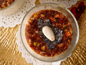 In a serving glass,add prepared sheer khurma then carefully place prepared date mousse disc over it.