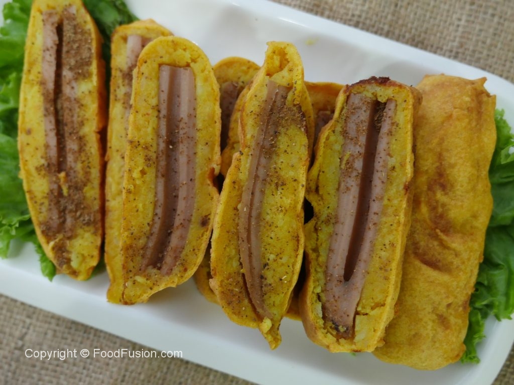 Now dip potato coated lotus root in gram flour batter and coat well.