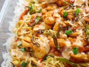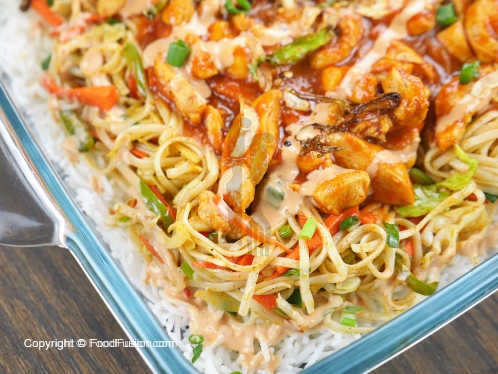 In a serving dish, spread a layer of rice on the dish. Add second layer of stir fried vegetables with noodles, than third layer of chicken gravy. Add mayo sauce and fried garlic and green chilies as top layer