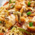 Ek serving dish main, Chawal ki layer laga lain, dosri layer fried vegetables +noodles ki aur phir third layer chicken gravy ki. Akhir main mayo sauce, fried lehsan aur fried hari mirch ki top layer laga kar serve Karain.