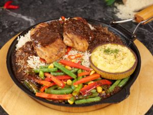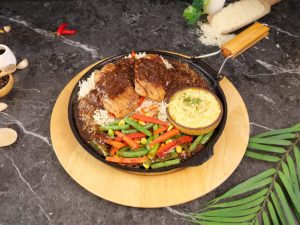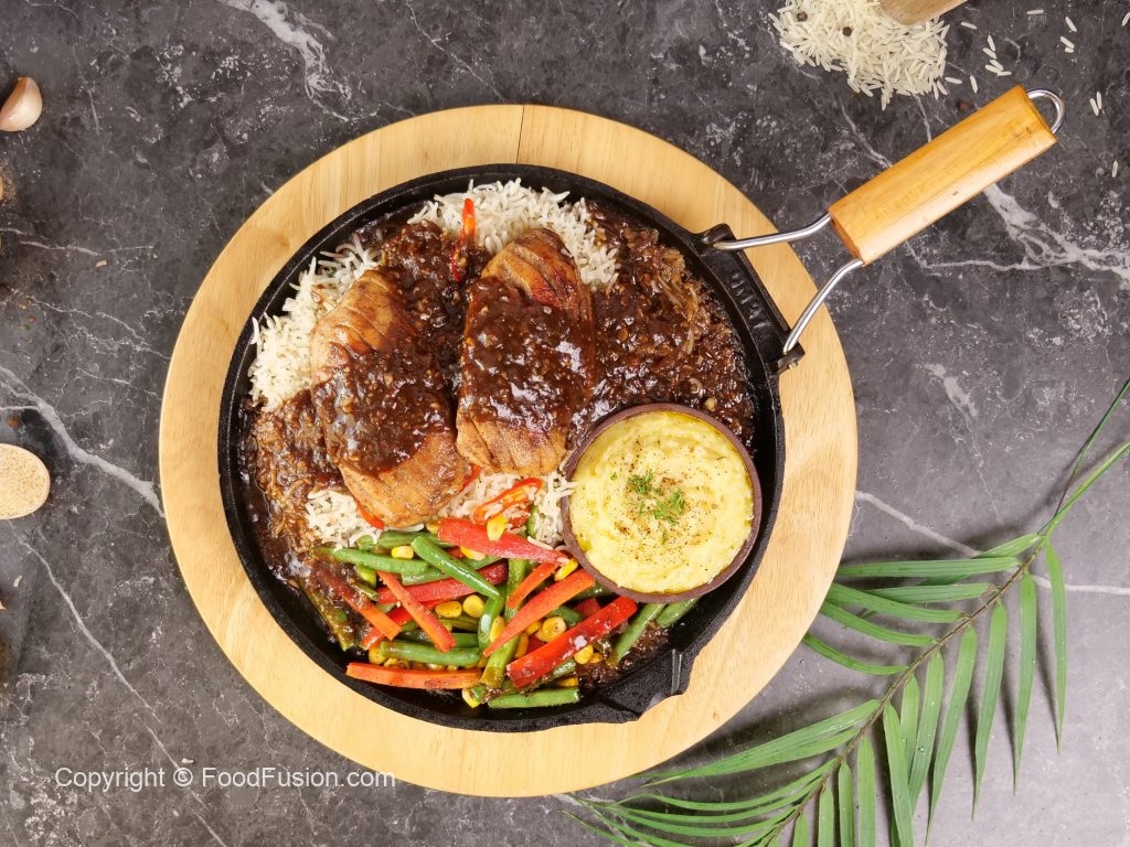 -Garlic fried rice,stir fried vegetables,creamy mashed potato,chicken fillets,garlic & pepper sauce dal ker serve karein!