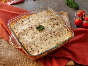 Lasagna sheets,red sauce,smoky chicken,white sauce,lasagna sheets,red sauce,cheddar cheese,mozzarella cheese dal dein,dried oregano aur lal mirch crushed chirak dein.