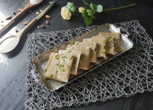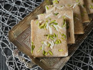 On greased tray 9 x 12“(with ghee),add prepared sooji mixture,desiccated coconut,almonds,pistachios & press firmly.