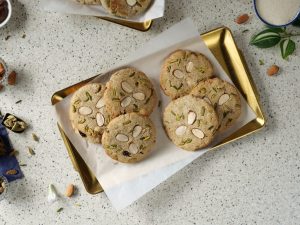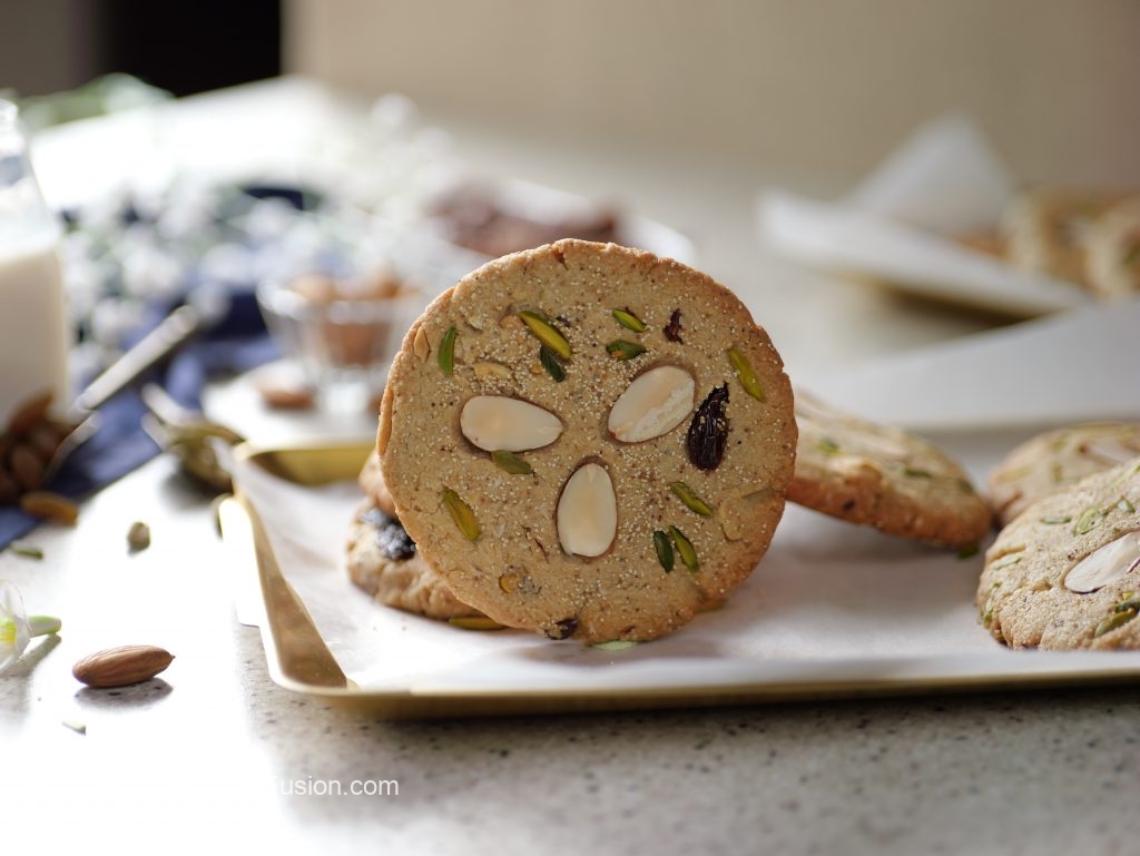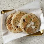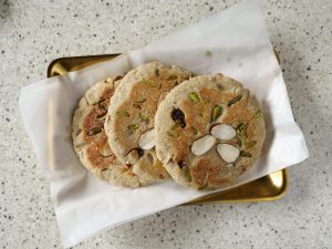 -Place it on a smooth surface,press gently,add almonds,pistachios & poppy seeds,cover with butter paper & press gently to spread it.