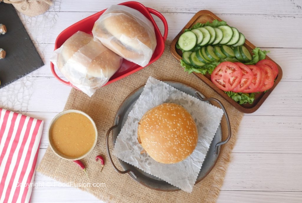 Top bun per mayonnaise dal ker pheela lein aur top bun sa cover ker ka burger tayyar ker lein (makes 5-6) & serve karein!