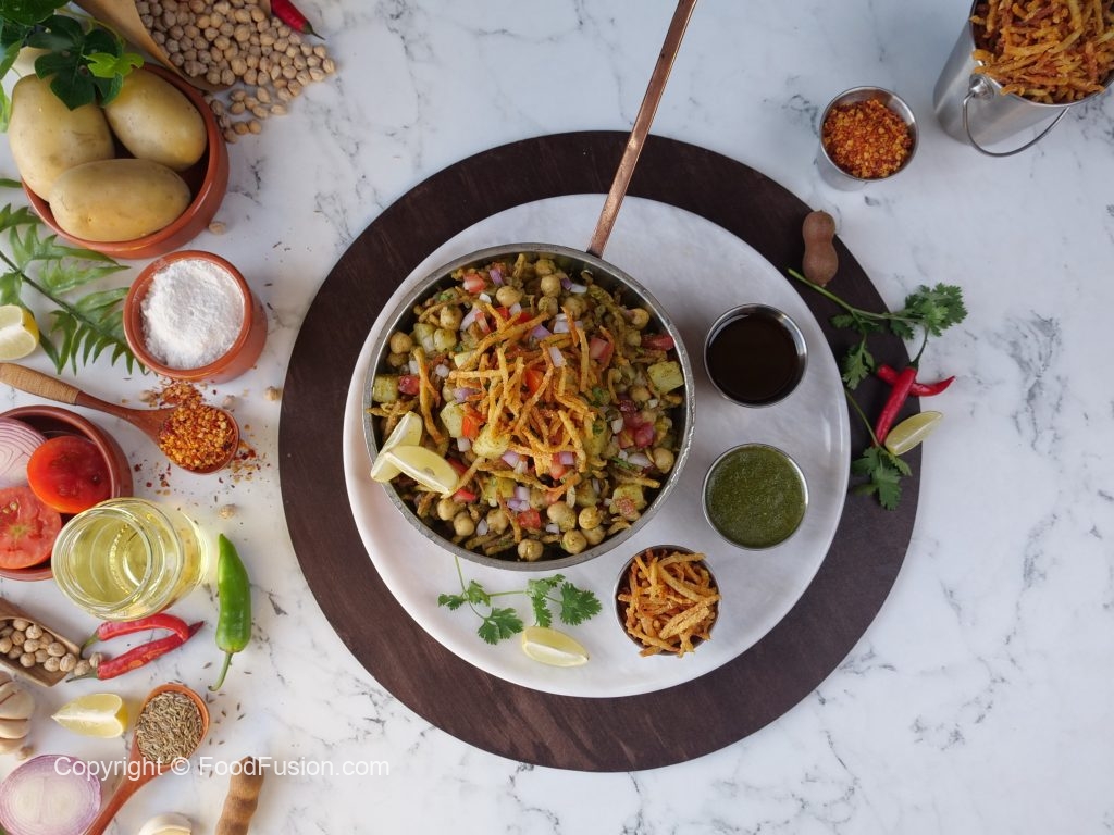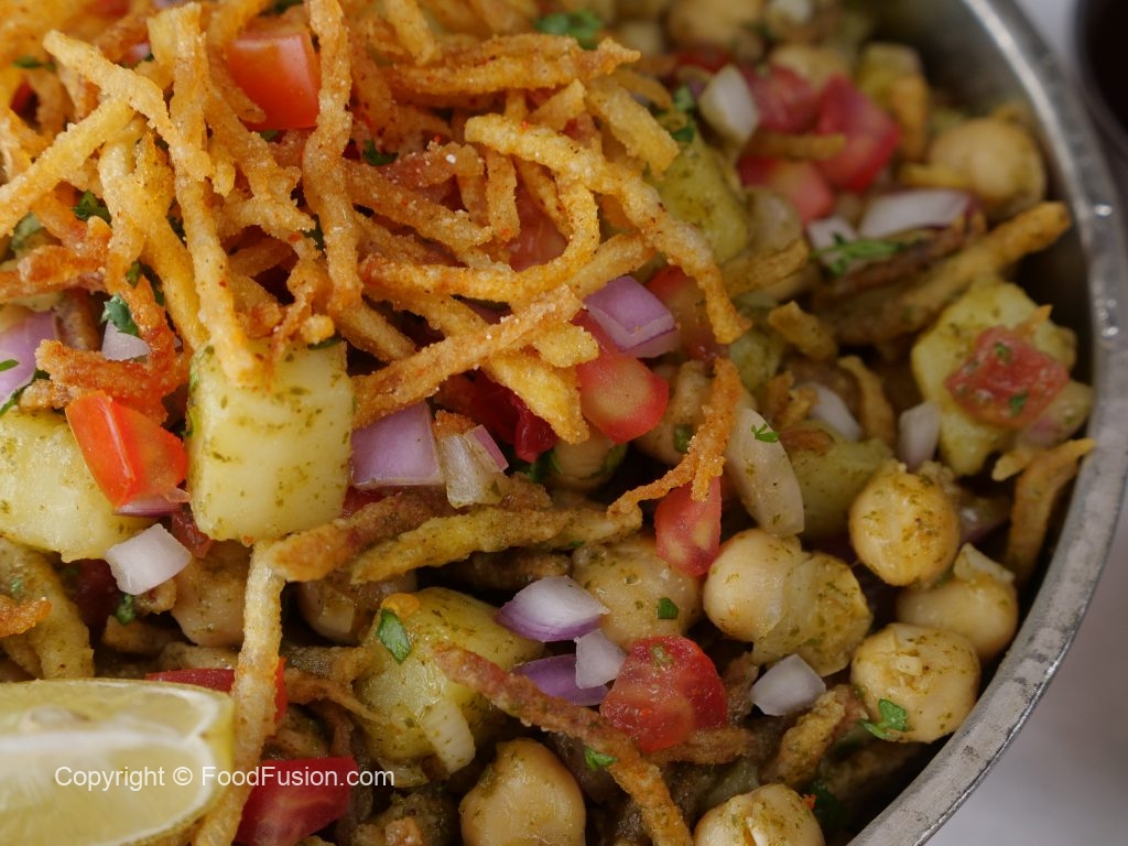 -In a bowl,add chickpeas,potatoes,tomato,onion,prepared chilli chips,spicy green chutney,sweet tamarind chutney,fresh coriander & lemon juice,mix well & serve!
