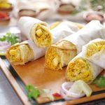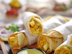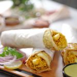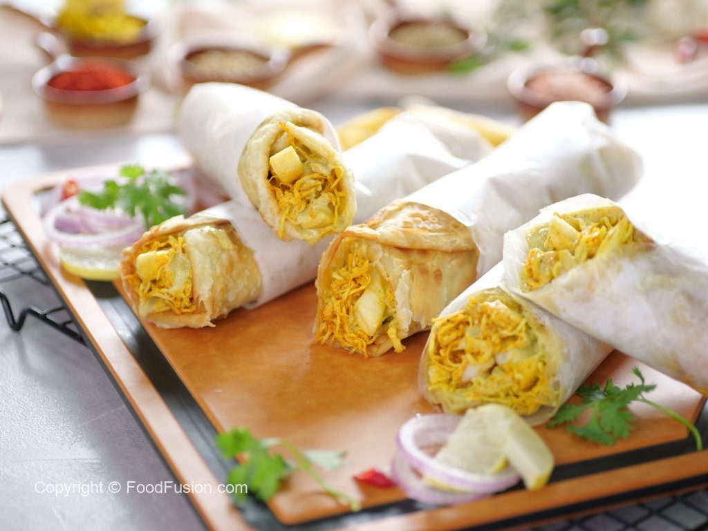 -On a paratha,add & spread prepared sauce,add chicken filling,french fries,prepared sauce & roll it.