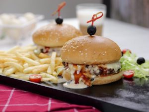 -On toasted burger bun,add & spread prepared cheese sauce,add iceberg,cooked beef patty with cheese,add cheese sauce,tomato ketchup & place another burger bun on top (makes 5).