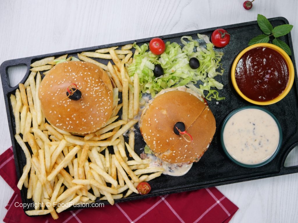 -Toasted burger bun per tayyar cheese sauce,iceberg,cooked beef patty with cheese,cheese sauce aur tomato ketchup dal ker upper sa burger bun rakh dein (makes 5).