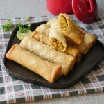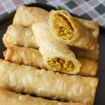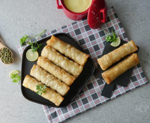 Samosa sheet/manda patti lein aur tayyar filling dal ker tamam sides ko fold ker ka roll ker lein aur maida ka paste laga lein.