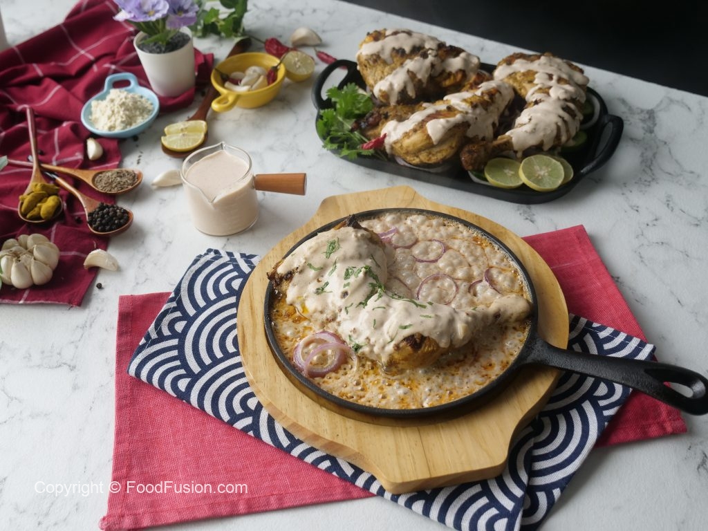 Cast iron plate ko garam karein,pyaz rings aur chicken tikka piece rakh dein aur upper sa tayyar cream & cheese sauce dal dein.