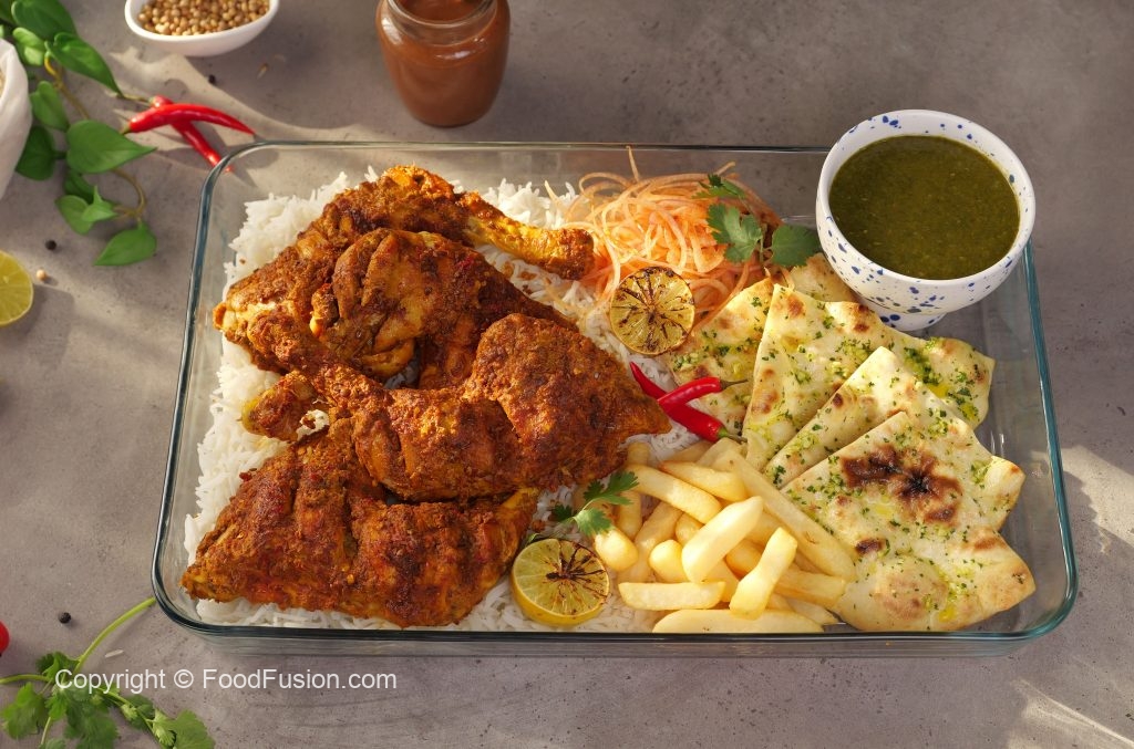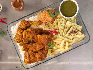 -Serve steam chicken with rice,garlic naan,french fries & tamarind green sauce!