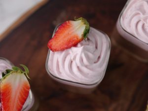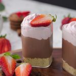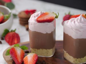 -In a serving glass,add crushed biscuits,prepared chocolate pudding & strawberry cream.