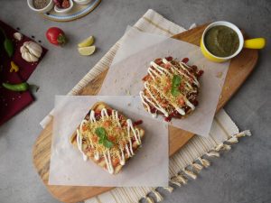 Place tomato slices,onion rings,mozzarella cheese & drizzle tomato ketchup.