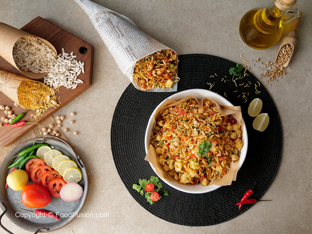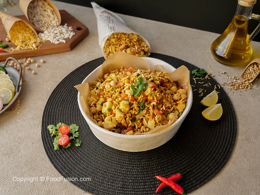 In a bowl,add roasted puffed rice,cucumber,onion,chickpeas,tomato,potato,green chilli,ginger,nimco mix,pickled oil,prepared spice mix,fresh coriander,lemon juice & mix well.