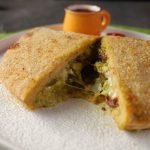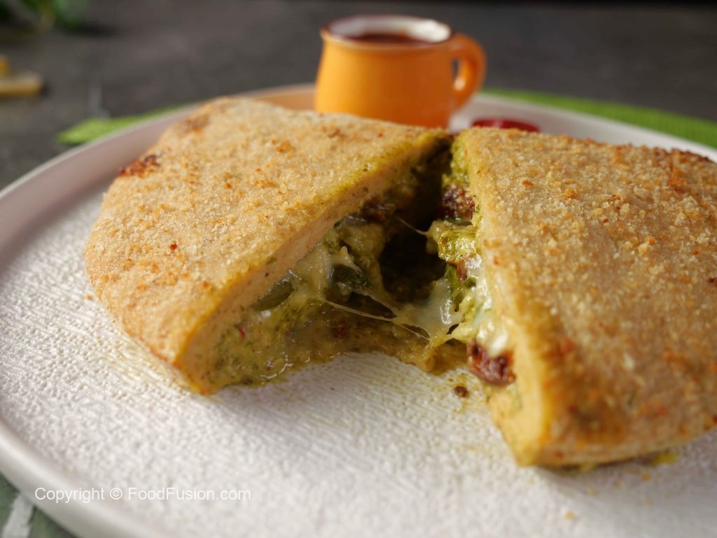 -Add prepared pesto & spread on half side,add mozzarella cheese,baby spinach,sun-dried tomatoes, fold,seal properly & coat with breadcrumbs.