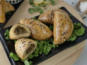 Dough ko ek side per tayyar filling 2 tbs dal dein aur dough ki side ko fold ker ka d-shape bana lein aur fork ki madad sa edges ko seal ker lein (makes 12).