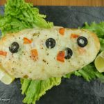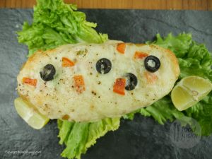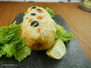 Fill potato with salt, butter, mince chicken, green onion, tomatoes. Add cheese on top, garnish with olives, black pepper and bake for 20 minutes.