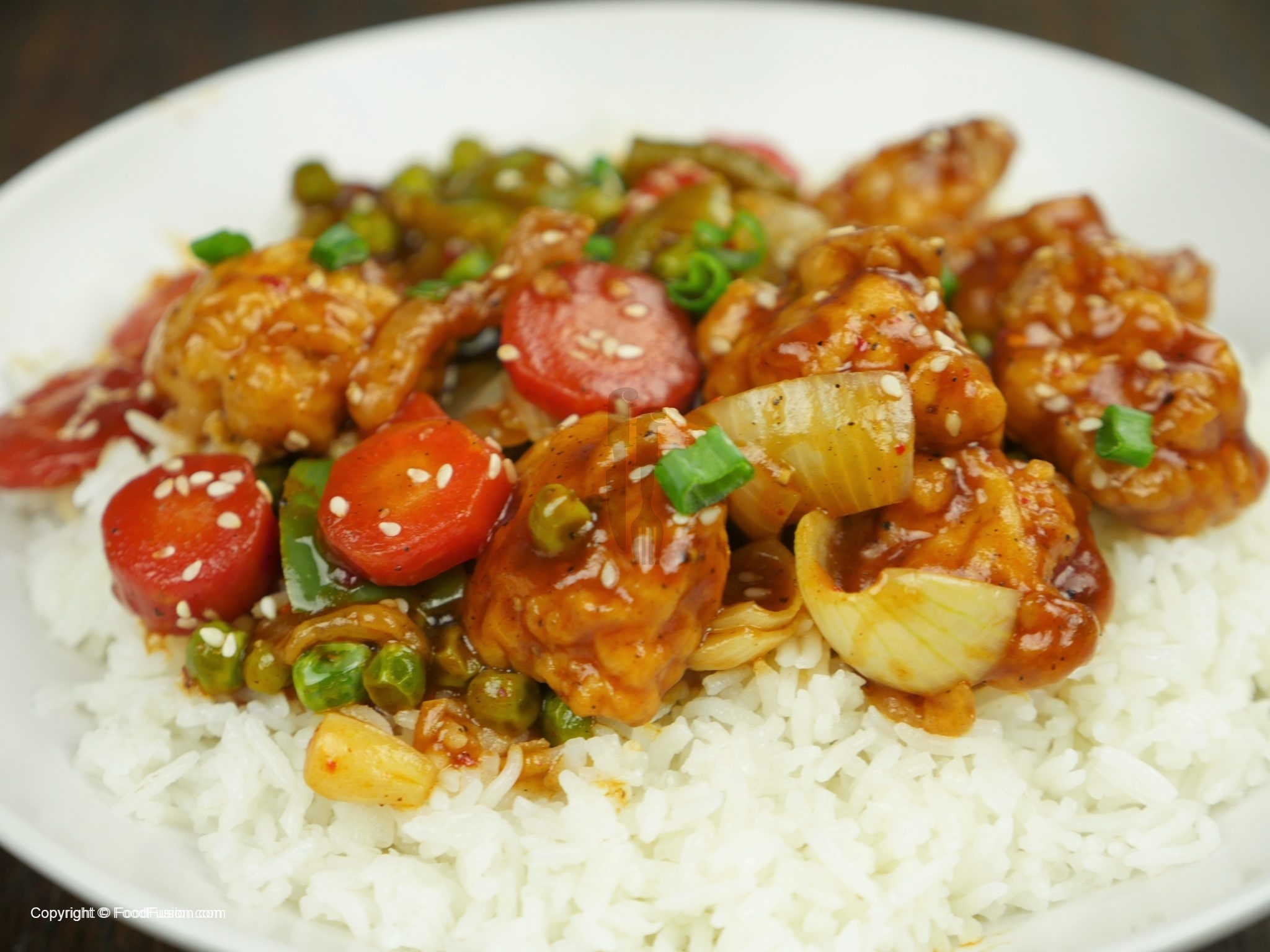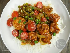 In wok,add oil and garlic (chopped) and sauté little. -Add tomato ketchup,soya sauce,worcestershire sauce,vinegar,brown sugar,red chili crushed,white pepper powder,black pepper crushed,salt and mix well. -Add chicken stock, mix it and bring it to boil. -Dissolve corn flour in water and mix well. -Add corn flour paste in gravy and give it a good mix. -Now add fried vegetables and cauliflower, mix it. -Add sesame oil and mix well. -Garnish with sesame seeds and green onion.