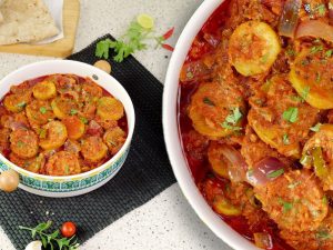 Serve tamatar ka khatta with bhindi ki sabzi & boiled rice.