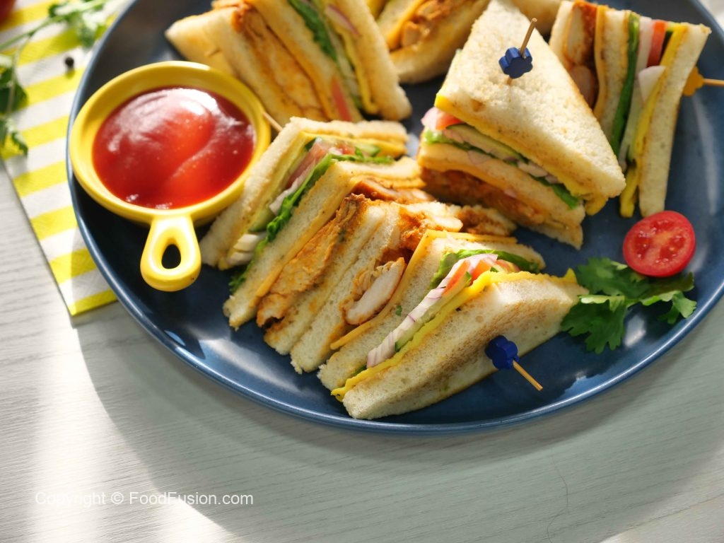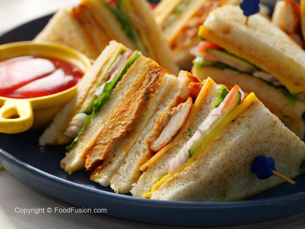 -Three bread slices per tayyar sauce,tandoori chicken pieces aur cheese slice dal ker flip ker lein phir tayyar sauce,salad patta,pyaz,tamatar,kheera aur cooked anda dal dein aur bread slice ko flip ker ka sandwich bana lein.