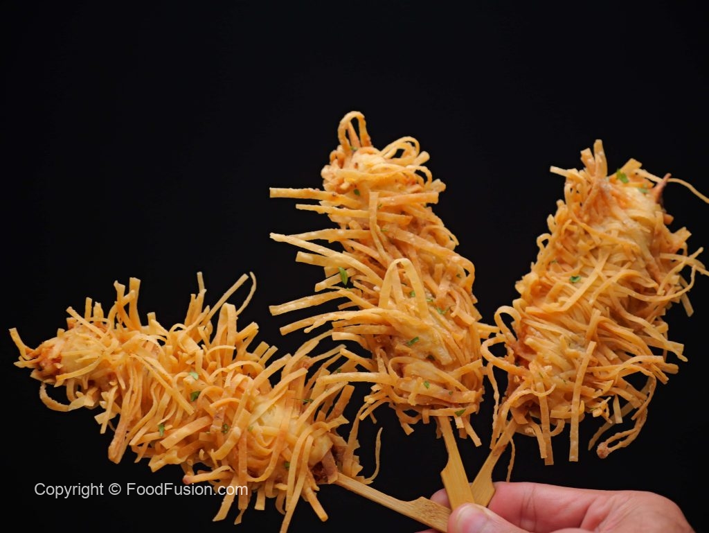 -In a wok, heat cooking oil (140 C) & deep fry skewers on low flame until golden & crispy (10-12 minutes).