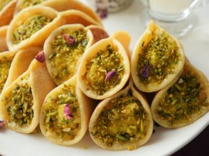 -Place pancake on baking paper,fold the corners of pancakes in a triangle shape & hold it for few seconds to stick together while the pancake is still hot (makes 11-12).