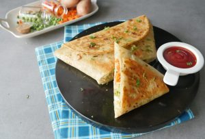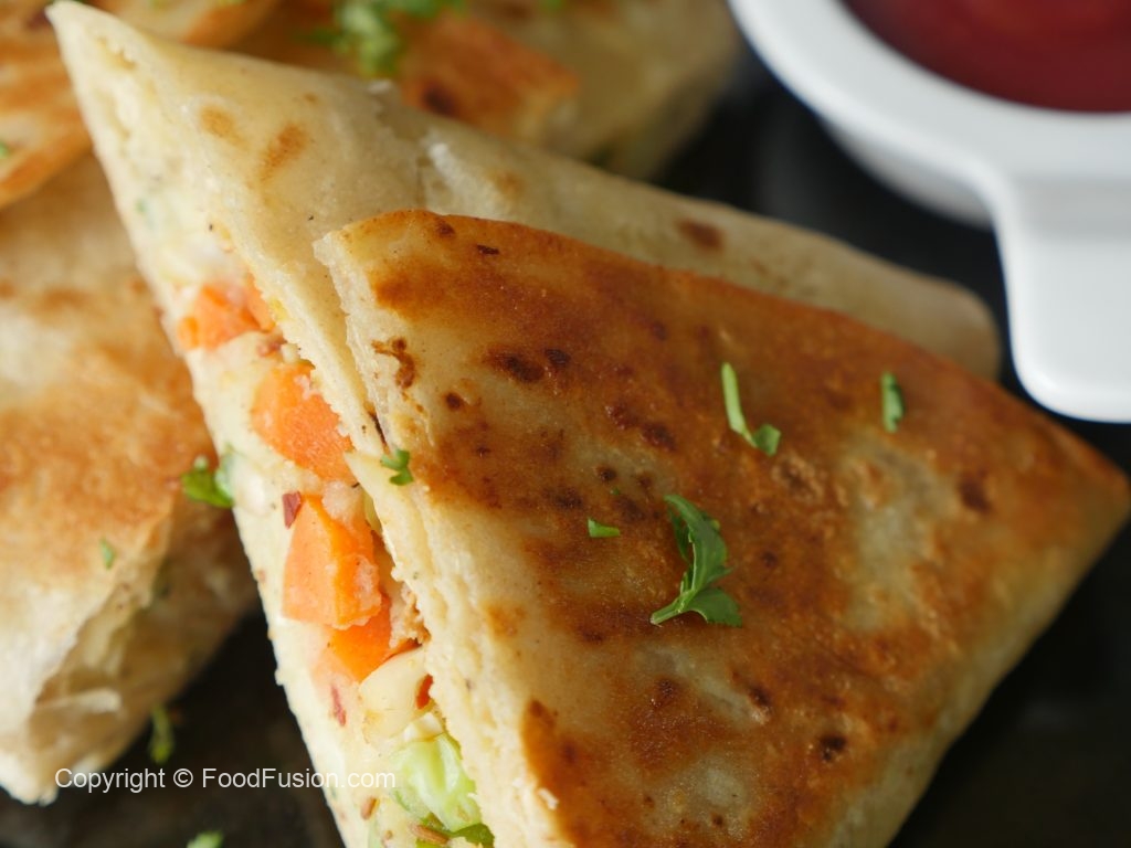 Vegetable filling dal ker tortillas/roti ko triangle mein fold karein aur aloo mixture dal ker seal ker lein (makes 2).