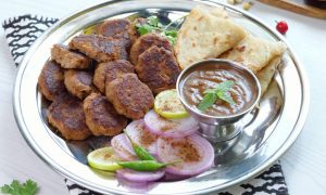 -In a large tray,add beef mince,chickpea flour,ground paste,raw papaya paste,pink salt,red chilli powder, garam masala powder,cardamom powder,mace powder,mix & knead well with the help of hands.